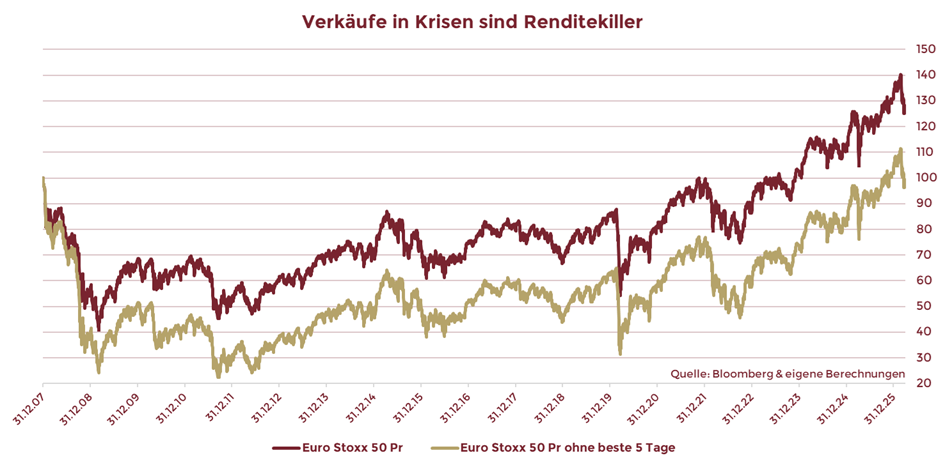 Noch ist der Krieg nicht vorbei und die Straße von Hormus geschlossen. Man hat aber in den letzten Tagen gesehen, dass jede positive Nachricht deutliche Kursgewinne an den Märkten zur Folge hatte. Deswegen ist es wichtig, trotz aller Unsicherheiten weiter investiert zu bleiben. Verpasst man diese Erholungs-Tage, verliert man auf längere Sicht viel Rendite.
